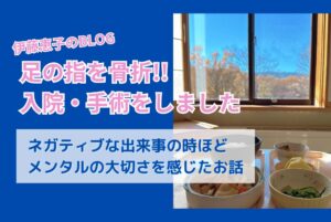 今回は、足の指の骨折を通じて 感じたことを皆さんにシェアしたいなと。 11月21日金曜日夕方に 家で足の親指ケガして緊急手術、入院。 25日に、無事退院しました。 そんなことから 健康って大切だね。 いつ何があるかわから … 続きを読む 足の指を骨折・入院・手術…ネガティブな出来事の時こそメンタルの大切さを感じます